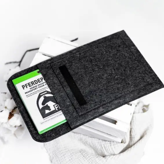 Knick in der Abstammung? Schluss damit! Die Equidenpasshülle schützt den Pferdepass vor Eselsohren, Leckerlispucke und fiesen Kratzern. Gut geschützt und hübsch verpackt in einer hochwertigen Filztasche, haben bis zu 3 Passhüllen ihren sicheren Platz!