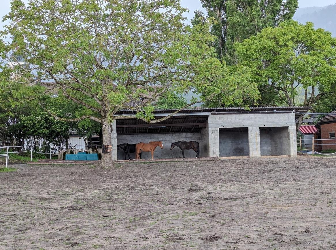 Wir haben unglaublich viel Platz um uns zu bewegen, auszuruhen oder auch den einen oder anderen Seich zu machen. Wir dürfen uns auf verschiedenen Untergründen austoben, aus einer grossen Schwimmertränke trinken, unter grossen Nussbäumen den Schatten geniessen, auf der riesigen Weide leckere Gräser und Kräuter mampfen plus vom Totholzhaufen Äste knabbern. Ausserdem haben wir ein "all-you-can-eat"