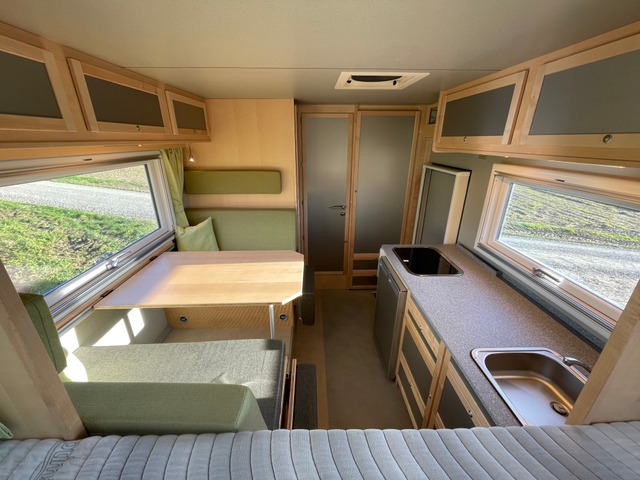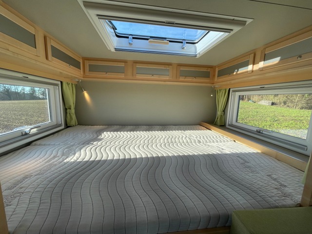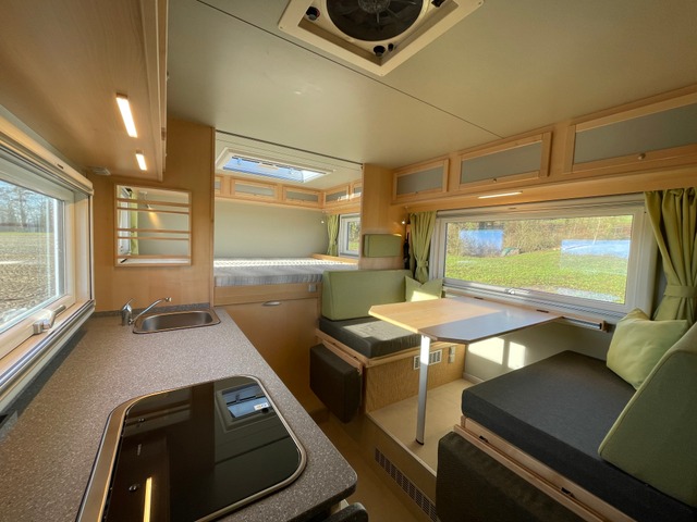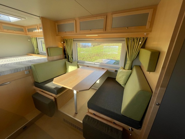 Bett durch die grosse Dachluke bestiegen werden, Dach begehbar bis 100kg - bequeme Dinette, umbaubar zu zusätzlichem Schlafplatz (1-2 Personen) - 5 zugelassene Sitzplätze -