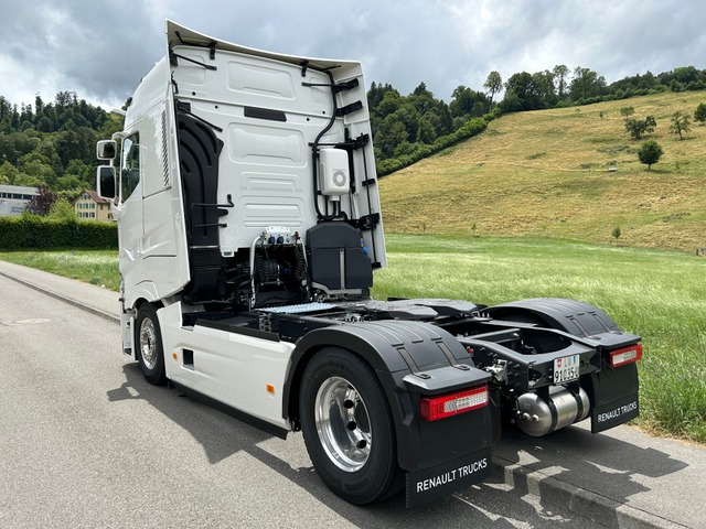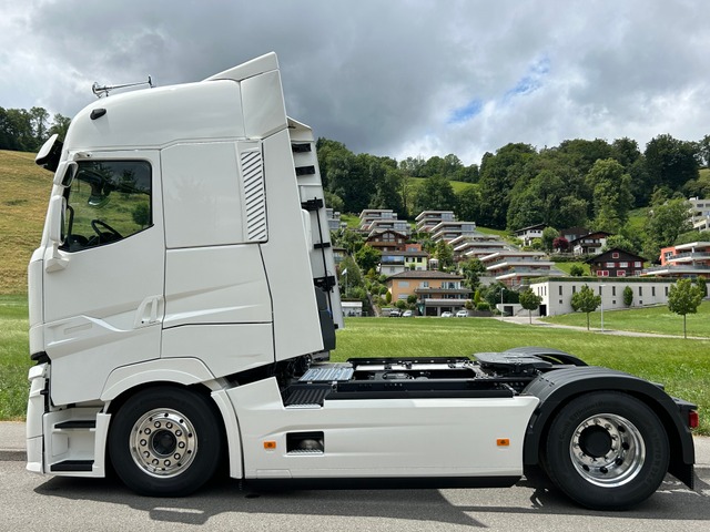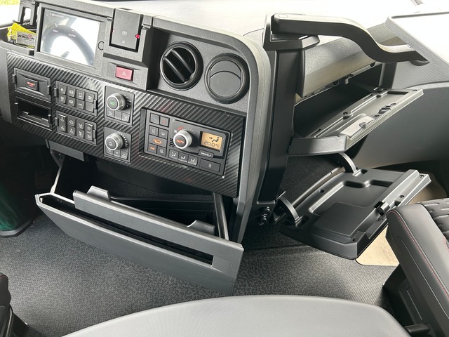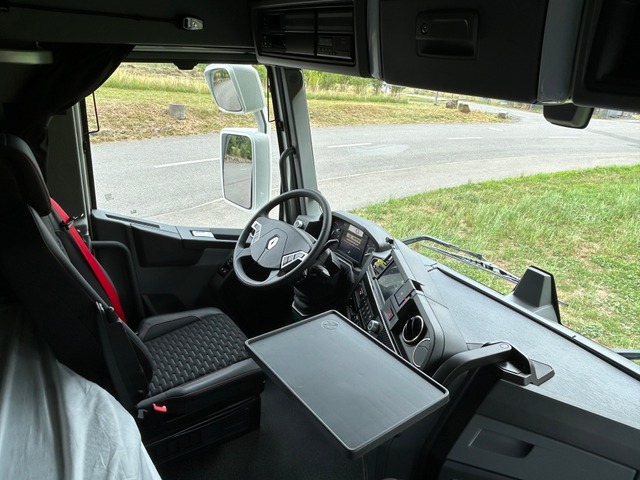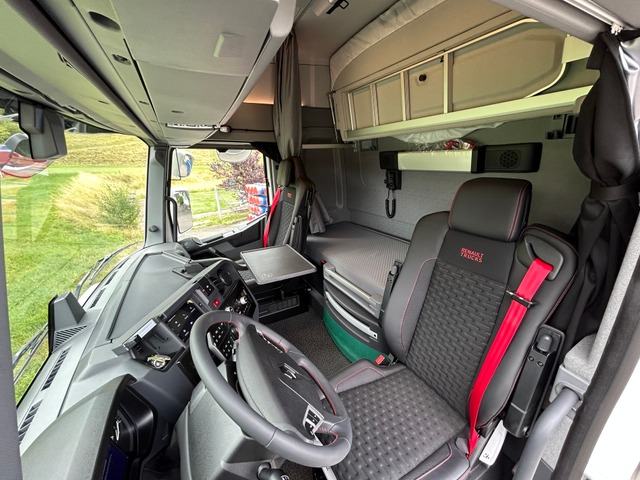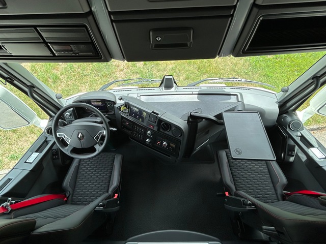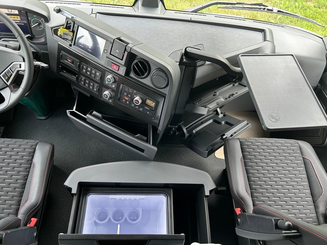 Sitzheizung und -Lüftung, LED-Rückleuchten, Drucklufthörner auf Fahrerhausdach, Dachspoiler, Schwenktisch am Armaturenbrett, Volllackierungsniveau Fahrerhaus, Soundsystem Focal