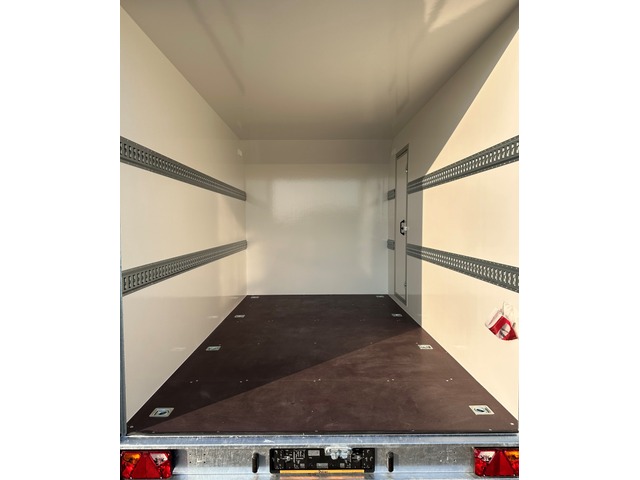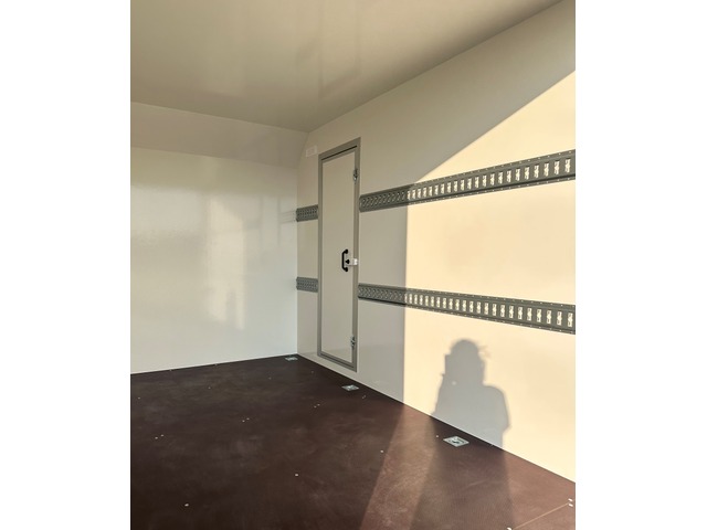 Siebdruckplatte. Doppelflügeltüren Hinten mit Drehstangenverschluss, abschliessbar. Servicetüre rechts, abschliessbar 2x Stützfuss Hinten mit Halter. 8x Bindeösen im Boden fixiert. 4x Zurrschienen (2 pro Seite) auf 650mm/1320mm Höhe montiert. 2x Lüftungen.