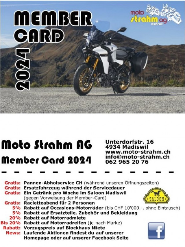 Mit der Strahm Membercard für Fr.100.- gibt`s 5% Rabatt (bis CHF 10´000.-) auf Occasionsfahrzeuge (ohne Eintausch) , 5% Rabatt auf Ersatzteile, Bekleidung, Zubehör, bis 20% auf Mietmotorräder und Pneu. Gratis Raclette-Essen für 2 Personen Ende Saison. Jede Woche ein Gratis Getränk im Saloon Madiswil. Gratis Pannendienst in der Schweiz während unserer Öffnungszeiten, Gratis Ersatzfahrzeug während der Servicedauer.