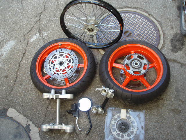 - dazu ein passender Supermoto Umbaukit mit neuwertigen orangen 17Zoll Kompletträdern von der 950Supermoto-R inkl. Bremsscheiben vo&hi sowie Zahnkranz und allen notwendigen Anbauteilen