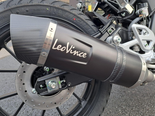 Equipée avec: Ligne complète LeoVince, Pack Moto Bolle (support de plaque court, clignotants, Rétroviseurs et Embouts guidon