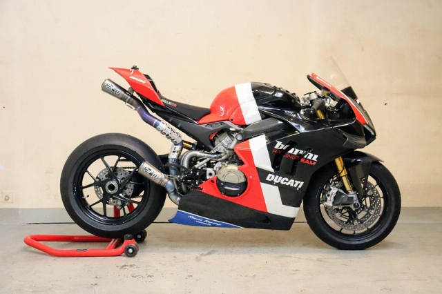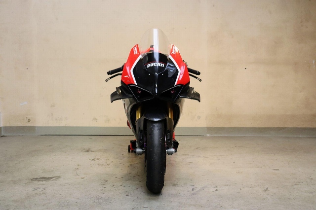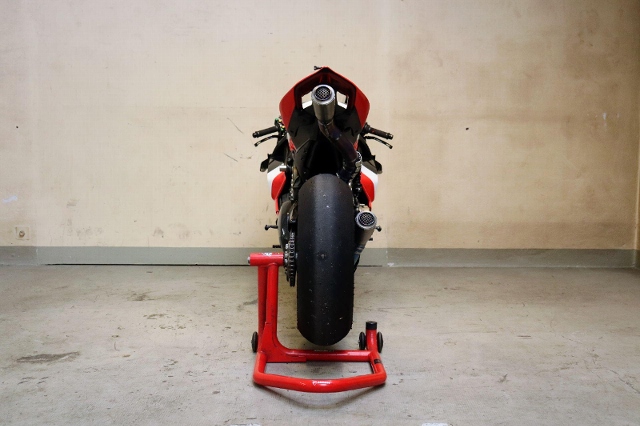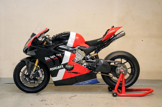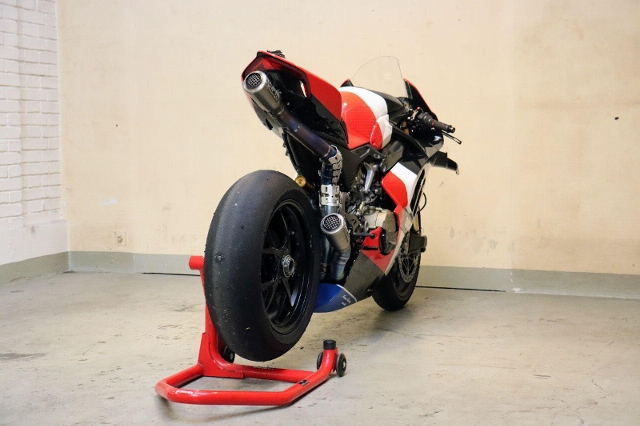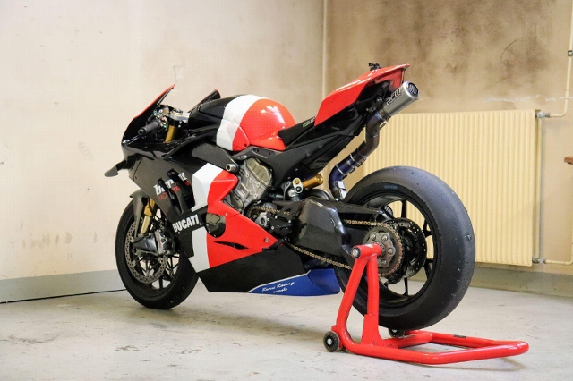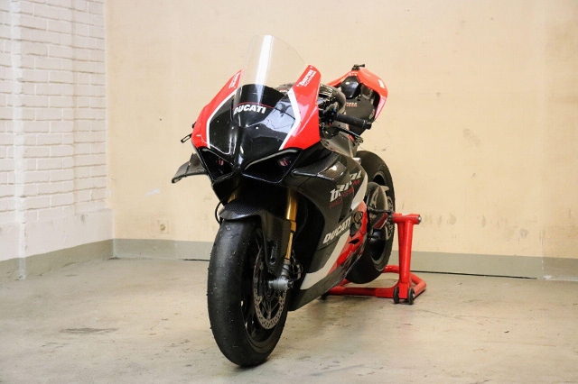 "Zum Verkauf steht eine Ducati Panigale V4 1103. Dieses Rennstreckenmotorrad wird nach einem kleinen Service mit neuen Reifen verkauft. Es wurde in der Vergangenheit vom Barni World Superbike (WSBK) Team aufgebaut. Das Motorrad verfügt über hochwertige Komponenten wie zum Beispiel ein Öhlins-Fahrwerk, eine spezielle Fussrastenanlage, eine FM-Komplettauspuffanlage mit einem Satz Ersatzschalldämpfer (leisere Variante) , neuen Dunlop-Reifen, ein Racing-Windschild, lackierte Rennstreckenverkleidung der R-Version, einen Race Sitz, Race Software, einen Lenkungsdämpfer, einen Aluminium-Tachohalter und vieles mehr."