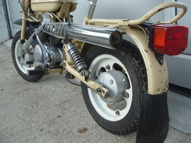 Moped aus russischer Produktion (Baujahr ca. 1979-82) im Scrambler-Look mit hochgezogener & verchromter Auspuffanlage und extremer Spitzwinkel Twin-Shock-Federung