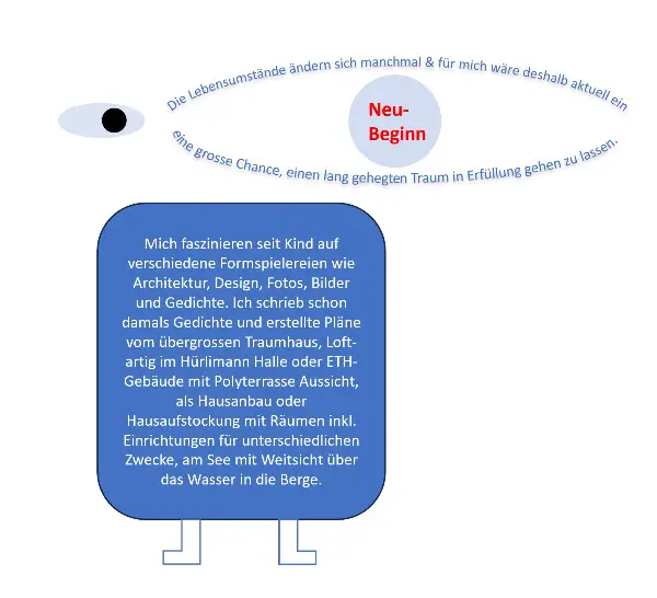 Mich faszinieren seit Kind auf verschiedene Formspielereien wie Architektur, Design, Fotos, Bilder und Gedichte. Ich schrieb schon damals Gedichte und erstellte Pläne vom übergrossen Traumhaus, Loft-artig im Hürlimann oder ETH Gebäude, als Hausanbau oder Hausaufstockung mit Räumen inkl. Einrichtungen für unterschiedlichen Zwecke, am See mit Weitsicht über das Wasser in die Berge.