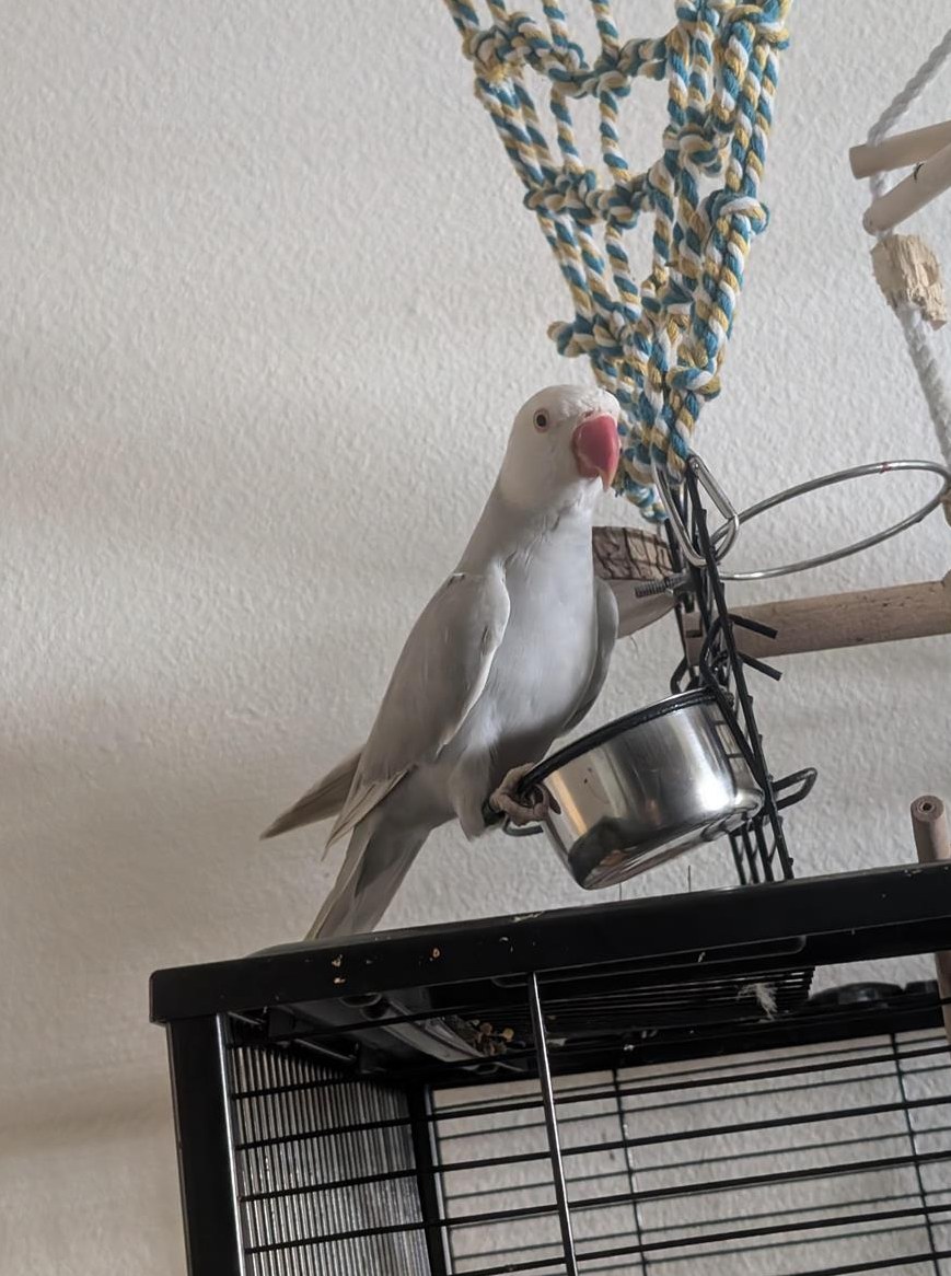 Louis (violetter bleichschwanz) ist 2 Jahre alt kommt auf die Hand und nimmt auch Futter und Schredder Material aus der Hand. Er kann sich auch drehen und lässt sich den Schnabel mit dem Finger berühren. Er ist ein sehr lieber, ruhiger und neugieriger