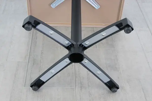 Die Tischplatten sind bereits mit 4 Muffen bestückt. Die Befestigung der Tischplatte am Gestänge erfolgt mittels