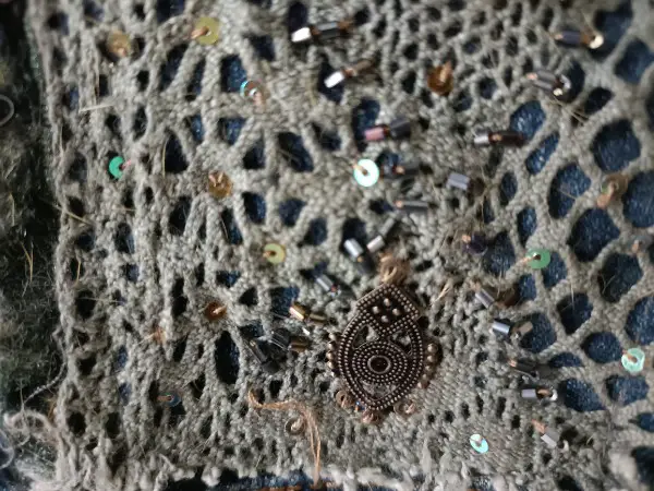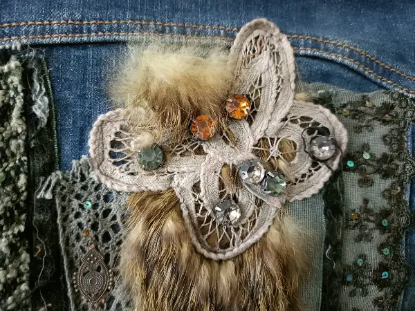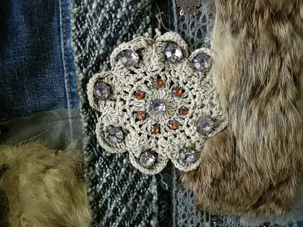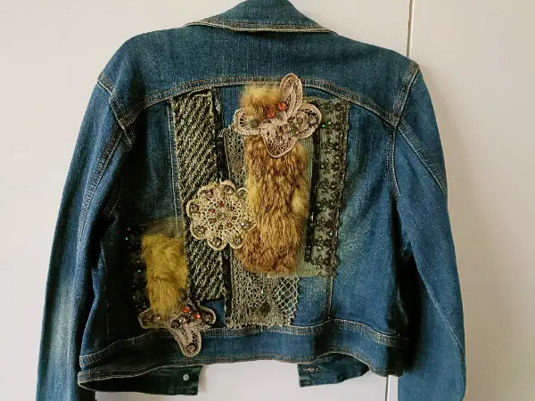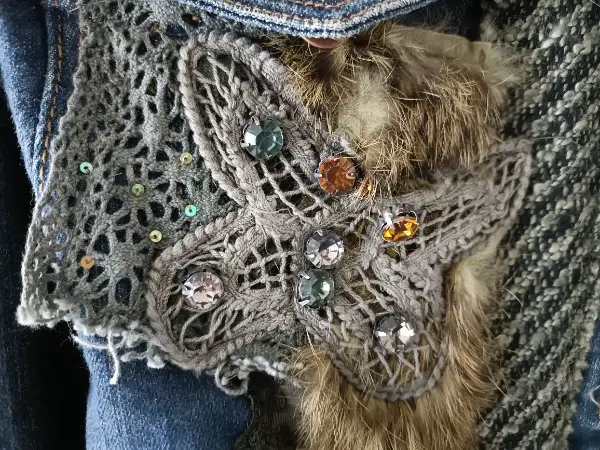 Diese Jacke sus den 90ern in Grösse S ist verziert mit Perlen, Stickereien, Fell etc. Sie wurde nie getragen, deshalb neuwertig.