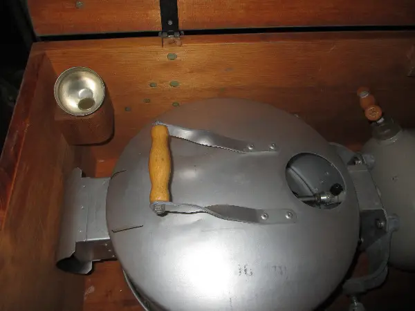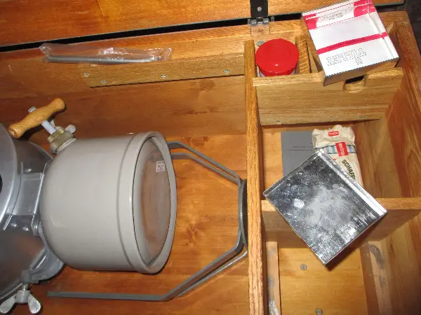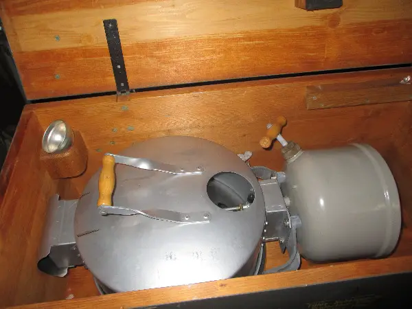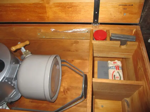 Holzkiste massiv und gut verpackt. Als Zubehör hat es ein Reglement, wie man denselben in Gebrauch nimmt, sowie ein Anzündschälchen in Plasticbüchschen, ein Trichter, ein Ersatzvergaserrohr mit Düsennadel (in Plastic verpackt) , und ein Schächtelchen mit ein paar Glühstrümpfen, siehe Fotos.