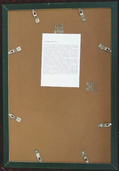 Material: Zeichenkarton hinter Glas, gerahmt. Rückseite Hartfaserplatte. Rahmen aus Holz, dunkelgrün.