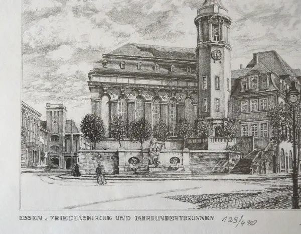 Bezeichnet: Unten links „Essen. Friedenskirche und Jahrhundertbrunnen“.