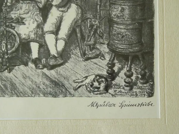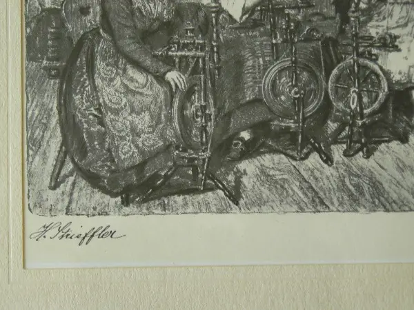 Unten links signiert "H. Strieffler", unten rechts bezeichnet "Altpälzer Spinnstube". Unten rechts in der Platte bezeichnet "H. Strieffler, Original Lithografie, H. Strieffler 1935, Landau Pfalz 1914". Demnach handelt es sich um eine Lithografie von 1914, von der er 1935 weitere Abzüge gemacht hat.
