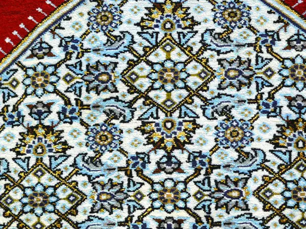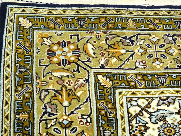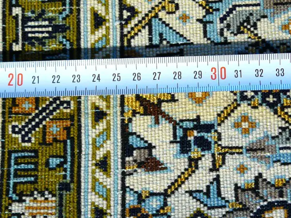 Bemerkungen: Alte originale Ghoms gehören zu den Exklusivsten und wertvollsten, was die orientalische Knüpfkunst hervorgebracht hat, wegen der hohen Produktionskosten werden sie kaum noch in dieser Qualität hergestellt. Dieser hier ist so gut und dicht verarbeitet, dass der optische Eindruck ihn wie eine Fläche aus Samt wirken lässt. Sehr strapazierfähig. Die Konturen der Muster sind aus goldfarbener Seide, dadurch wird der exklusive Gesamteindruck noch verstärkt.