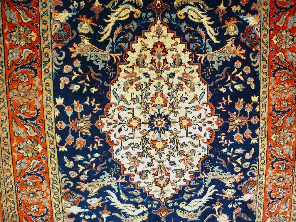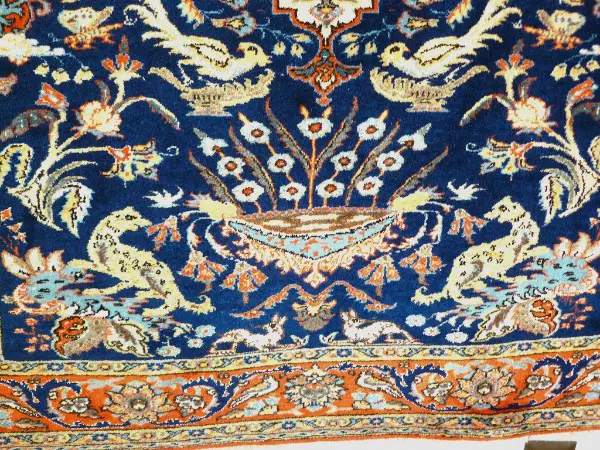 Kunstwerk. Der Grund des Medaillons, die Tiere und die meisten Konturen der floralen Motive sind aus Seide. Solche Teppiche gehören zum Besten, was die orientalische Knüpfkunst zu bieten hat. Die Seide ist in einem solchen Winkel geknüpft, dass der Glanz besonders zur Geltung kommt. Ich benutze solche
