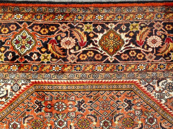 Muster: Die Knüpfer haben sich ganz offensichtlich an einer alten Ferragan-Arbeit orientiert. Dafür spricht die auch in anderen Bidjar-Teppichen immer wieder anzutreffende sürmeygrundige Herati-Bordüre, ebenso wie das den ganzen Teppich ausfüllende, im Kolorit jedoch wechselnde, aufgelöste Heratimotiv, sowie das treppenförmig zu Giebeln gestaltete Zentralmedaillon.