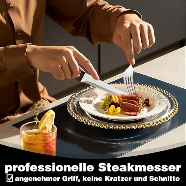 Exquisite Handwerk & ergonomisches Design. Glatte Kanten und die klassische Form Design machen das besteck set aussehen exquisit. Es gibt keine rauen Stellen oder scharfen Kanten an den Messern, Gabeln und Löffeln, die sehr bequem zu benutzen sind, ohne Ihren Mund zu verletzen. Darüber hinaus haben unsere Tafelmesser und Steakmesser scharfe Klinge, die grosse Zacken enthalten kleinere Zacken, um die Schärfe zu gewährleisten und die ergonomische Griff machen Sie bequem und einfach zu bedienen.