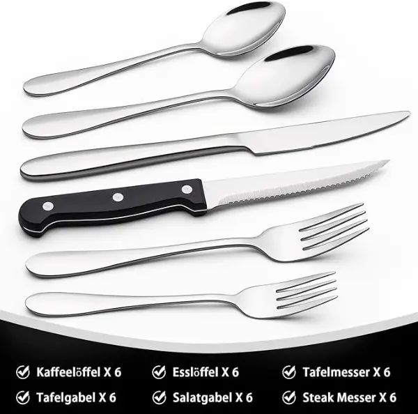 36-teiliges Besteckset für 6 Personen. 30-teiliges Besteck-Set mit 6 Steakmessern Bestehend aus 6 Messern, 6 Gabeln, 6 Löffeln, 6 Salatgabeln, 6 Teelöffeln, 6 Steakmessern, Dieses silberne Besteckset erfüllt alle Ihre Essbedürfnisse.