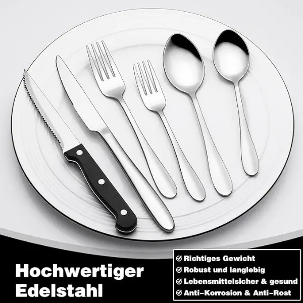 100% Edelstahl. Unser Besteckset ist aus hochwertigem, lebensmittelechtem Edelstahl gefertigt, der sehr langlebig, korrosionsbeständig und rostfrei ist und keine Rückstände oder Gerüche wie andere Materialien produziert. Unterdessen sind unsere Bestecksets robust und langlebig zu gewährleisten, dass nicht nur nicht leicht zu verbiegen, sondern auch bieten Ihnen mit langfristigen Einsatz.