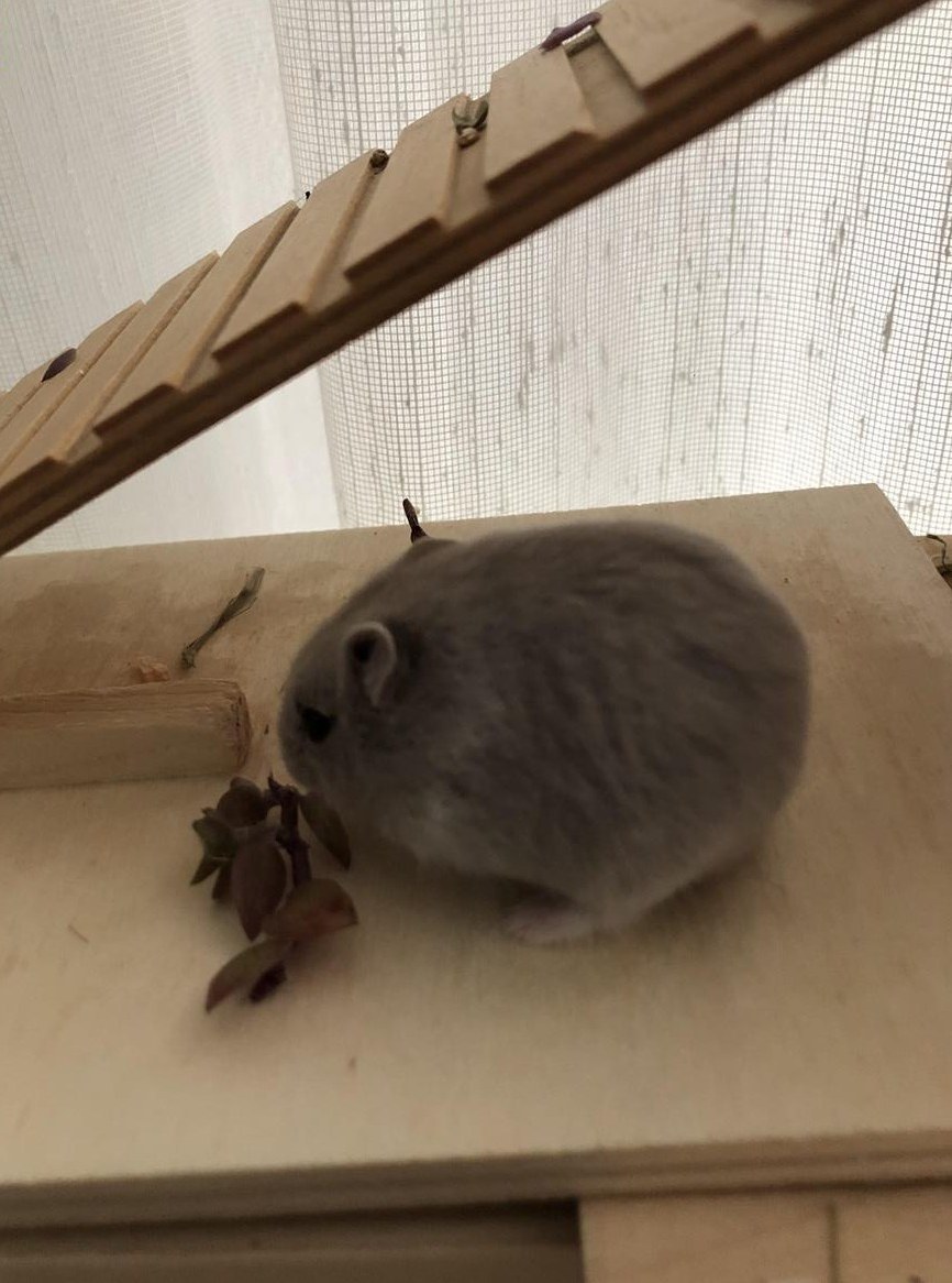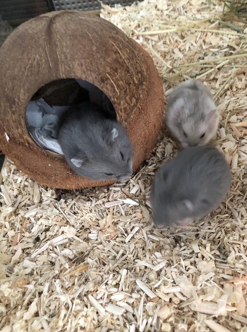 Die kleinen Zwerghamster sind an die Hand gewöhnt und lieben abwechslungsreiches Fressen mit frischem Grün.