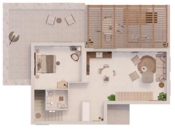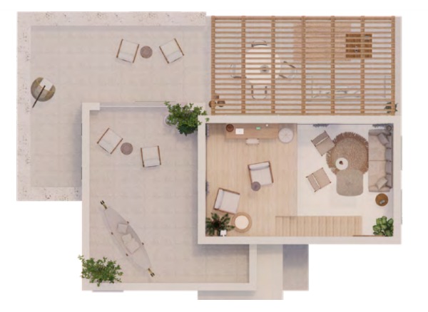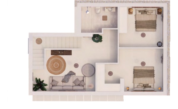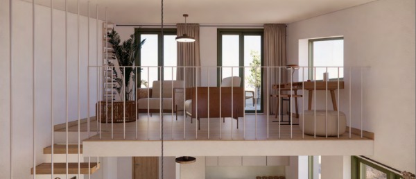 Die obere Ebene umfasst ein Zwischengeschoss mit Zugang zu einer Dachterrasse mit atemberaubendem Meer- und Bergblick.