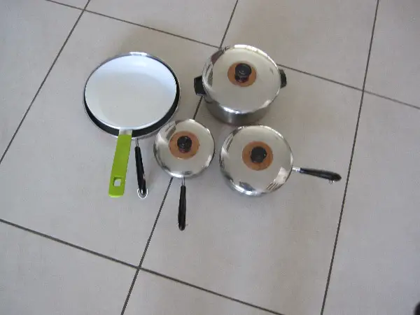 Camping-Geschirr/-Besteck, MELAMINE, wenig gebraucht, neuwertig, 3 Schüssel, 2 Schüssel rund, 4 Teller rund, 4 Teller eckig, 4 Dessert-Teller, 2 Bratpfannen, 3 Pfannen, Besteck 4-teilig,