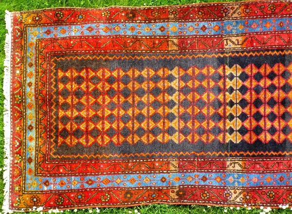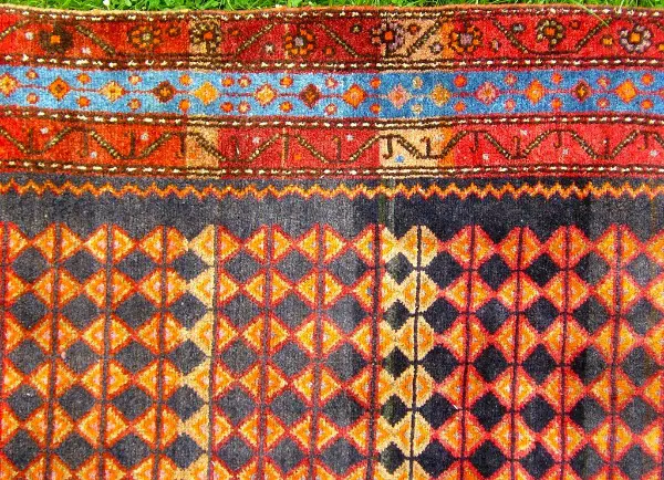 Bemerkungen: Folkloristischer Dorfteppich. Harte Wolle, kurze Schur. Das Besondere daran ist, dass der Teppich trotz des hohen Alters ohne Gebrauchsspuren ist, Abrasch und farbliche Veränderungen werden dann erst sehr spät sichtbar. Auf Kunstauktionen sind solche Unikate immer für eine Überraschung gut.