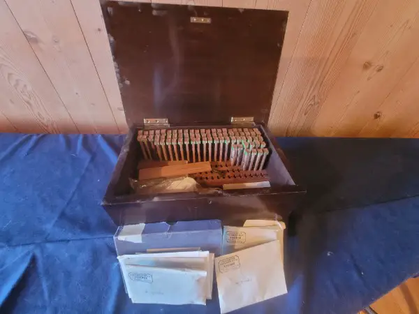 Dazu ein originales Kästchen mit Springern und Saiten.
