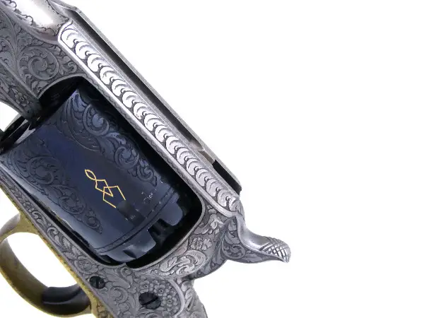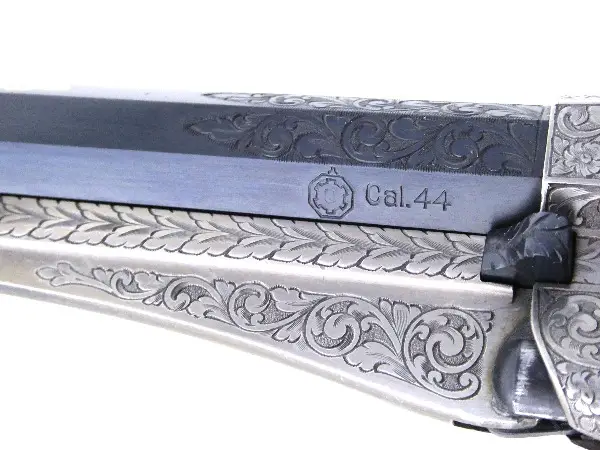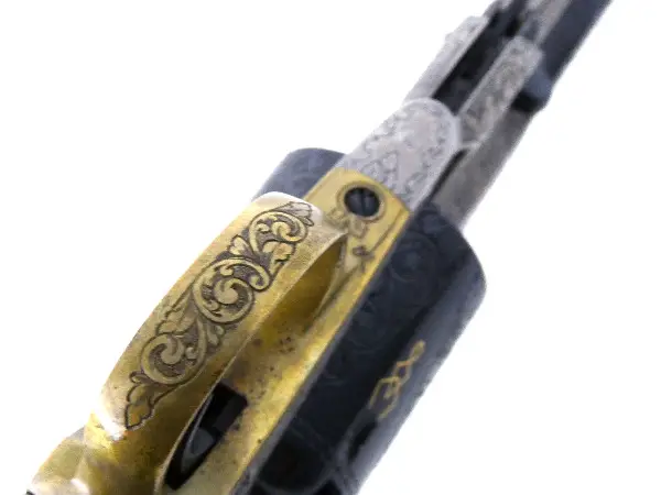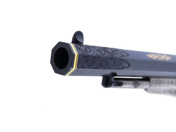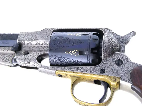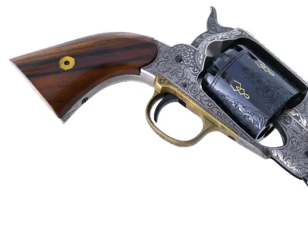 vorderlader Revolvers in Luxus Ausfürung, hübsch Graviert und mit Gold Einlagen. Wohl aus den 1970er Jahren, in neuwertigem Zustand. Kal. .44