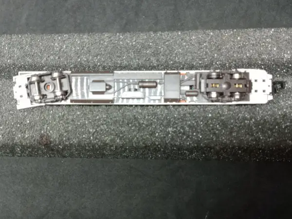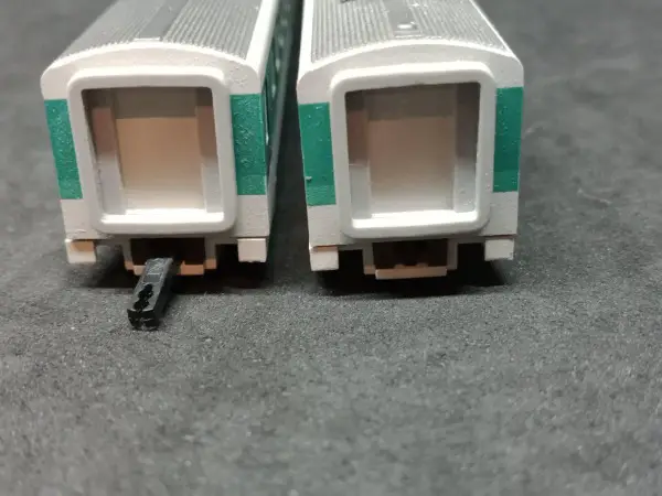 Dem Zug wurden zwei Stromabnehmer aufgeklebt, einer wurde entfernt, dies hat auf dem Dach Spuren hinterlassen.