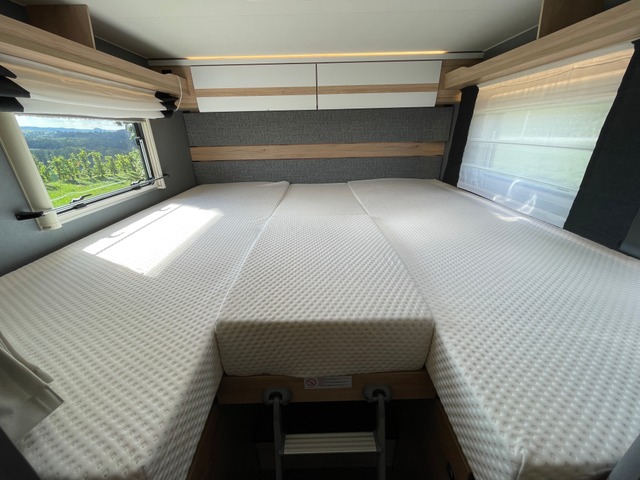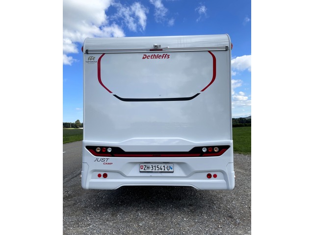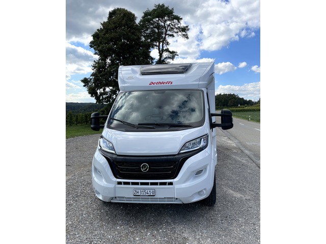 Kühlschrank mit separatem Frosterfach und automatischer Energiewahl (AES) (137 l) - separate Dusche, Tür von Badezimmer schliesst auch im Gang als Raumtrennung - Gas Warmluftheizung Truma Combi 6E mit 10L Warmwasserboiler und Elektroheizfunktion - Frischwassertank 116l im isolierten und beheizten Bereich, Abwasser aussenliegend 90l isoliert und elektrisch beheizbar - 2x 95Ah Bordbatterie, AGM (Total 190Ah) - Gasanlage mit automatischer Gasflaschenumschaltung inkl. Crash-Sensor, Eis-Ex und Gasfilter. - hochwertige Rahmenfenster mit Verdunklung & Mückenschutz - Vorbereitung für Dach-Klimaanlage, SAT-Anlage, Solar - indirekte Ambientebeleuchtung über den Dachstauschränken - indirekte Wandflächen-Ambientebeleuchtung - grosszügige Längssitzgruppe, umbaubar für 2 Sitze während der Fahrt - Festbetten mit ergonomischen Holzlattenrosten und 150 mm starken 7-Zonen Premium Matratzen aus klimaregulierendem Material - Bettumbau Einzelbetten zu Doppelbett - Thule Omnistor Markise 4.5m (noch nicht auf den Fotos) - und vieles mehr! Unsere Gewichtsangabe: Einige Anbieter weisen teilweise sehr optimistische Werte aus, die meist nicht der Realität entsprechen. Unser angegebenes Leergewicht von 3'045 kg beinhaltet das effektiv in der CH gewogene Fahrzeug, einen vollen Dieseltank, 20L Frischwasser und 75kg für den Fahrer. So verbleibt bei diesem Fahrzeug eine gute Zuladung von 455 kg. Wir sind seit über 15 Jahren Ihre offizielle Dethleffs-Vertretung. Auch nach dem Kauf sind wir mit unserer kompetenten