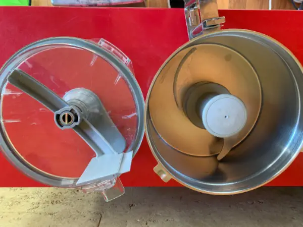Ein Vorteil gegenüber anderen Cuttern ist der Abstreifer am Deckel, womit während der Bearbeitung das Füllgut bewegt und vom Deckel sowie der Seitenwand abgeschabt werden kann.