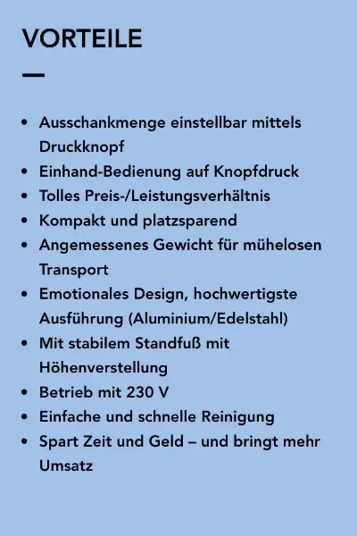 Ausschankmenge. Der Shot Cup 2 hat (mit 10 Prozent Reserve gerechnet) eine Ausschankleistung von 30 Liter je Stunden somit ca. 150 Tassen a 200 ml.