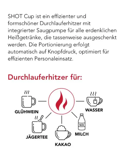 Professioneller Durchlauferhitzer für Glühwein und verschiedene Arten von Heissgetränken. Geeignet für den gewerblichen Einsatz. Platzsparend und mit optisch ansprechendem Design.
