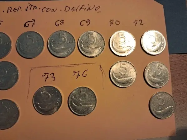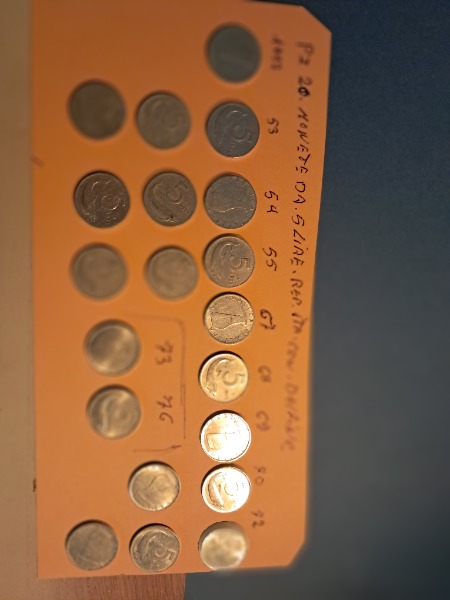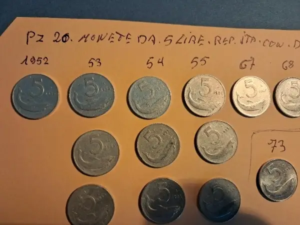Vendo dalla mia collezione pz 20 monete da 5 lire della rpublica Italiana . Con delfino . vedi foto con