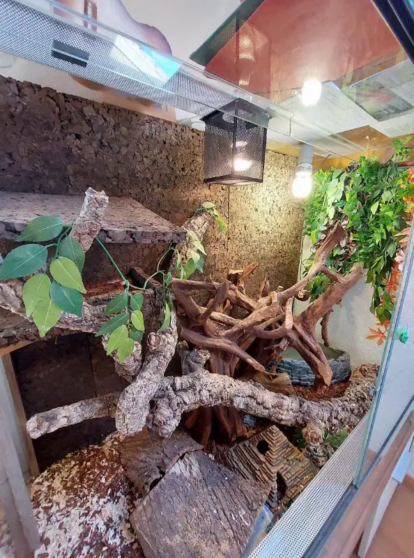 Das Terrarium hat die Masse 120x100x60 und würde samt Inhalt (Wasserbecken, Plattform, Wettbox, Höhle, zwei Kletterhölzer, Plastikbegrünung und Wärme- und UV-Lampe) mit verkauft werden.