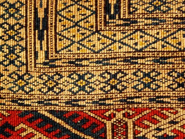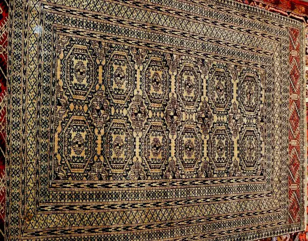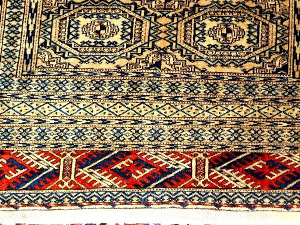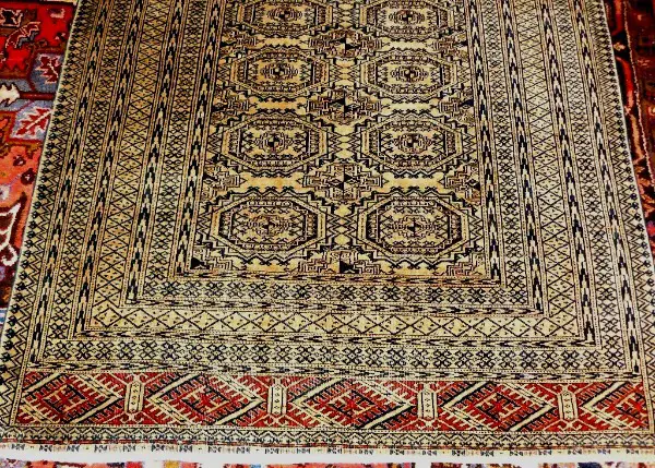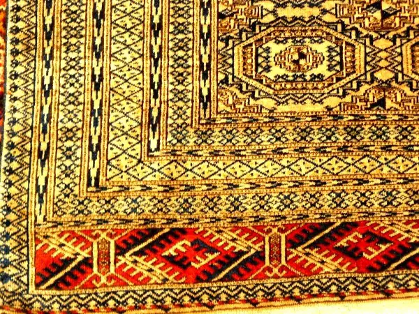 Bemerkungen: Beste Hochlandwolle. Feste Knüpfung und Struktur. Alte Stücke sind gesuchte Sammlerteppiche, Wandteppiche aber auch gute Bodenteppiche. Es ist eine besondere Kunst der Saryken, komplizierteste geometrische Muster so zu knüpfen, dass sie symmetrisch exakt aufgehen. Um diese gleichmässige farbliche Veränderung auf Vorder- und Rückseite zu erreichen braucht es mindestens 150 Jahre. Über diese Teppiche gibt es viel Literatur.