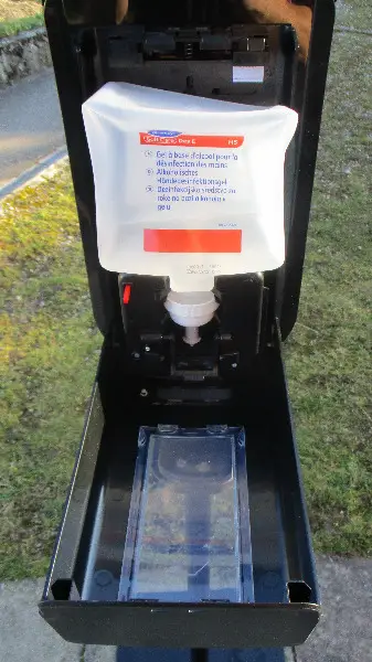 Er hat eine Schale um Desinfektionsmiittel aufzufangen, falls die Hände zu früh zurückgezogen werden. So fällt das Mittel nicht auf den Spenderfuss / Boden.
