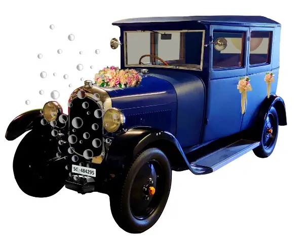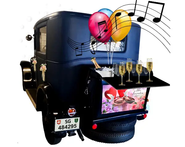 Gerät ist im vorderen Bereich des Oldtimers platziert und verleiht dem besonderen Tag Leichtigkeit und Freude.