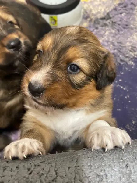 Alle Welpen sind fauvre mit weissen Abzeichen.