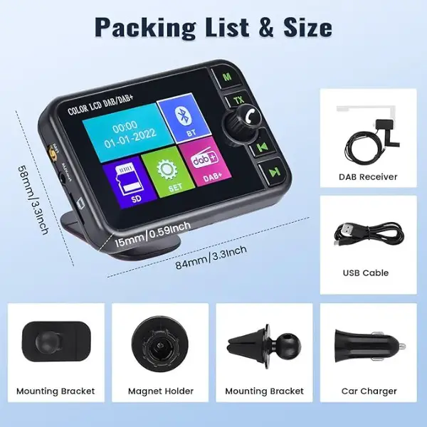 Musik und andere Radiosender zu hören. Hochempfindliche aktive Antenne-Die hochempfindliche aktive Antenne hilft, Interferenzen durch andere Signale zu vermeiden, um ein stabiles und reibungsloses Radiohören zu gewährleisten. DAB-Autoradioadapter mit 2,4-Zoll-Farb-LCD-
