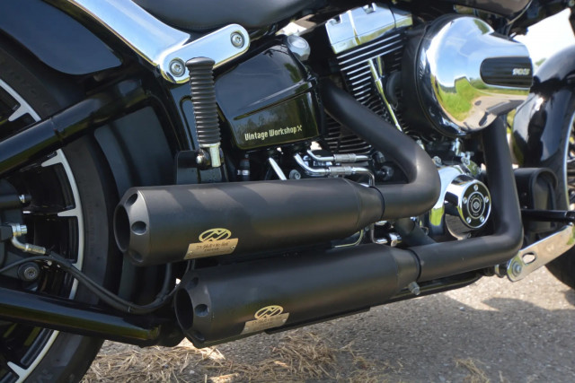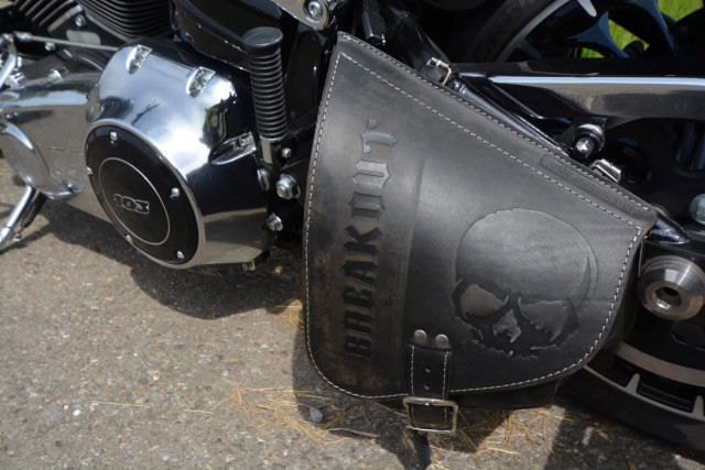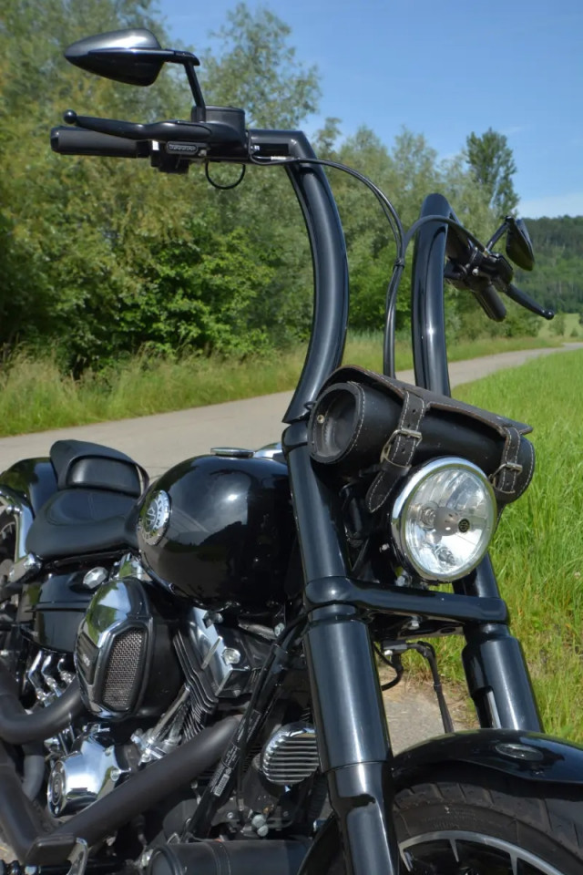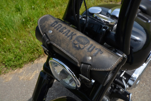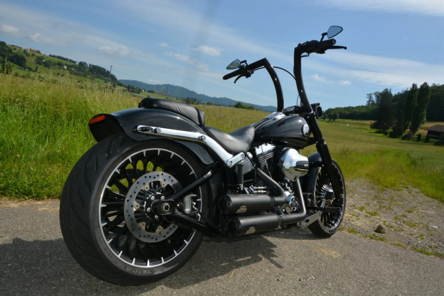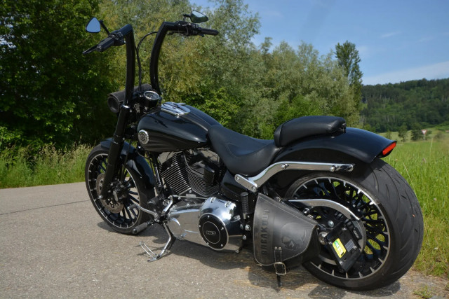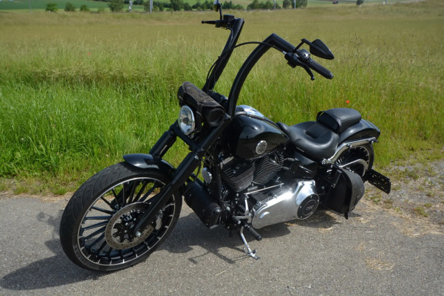 Jekill & Mr. Hyde Auspuff, Apehanger-Lenker von Burleigh Bars, Schwingentasche und Werkzeugrolle m. Breakout Schriftzug, Sissybar. Das Bike befindet sich in einem gepflegtem Zustand. Leider fahre ich viel zu wenig damit, da ich noch eine E-Glide fahre. Der vordere Reifen muss noch ersetzt werden. Dann wird ein Service und eine MFK-Vorführung fällig. Ansonsten ist das Bike fahrbereit und fährt sich sehr gut.