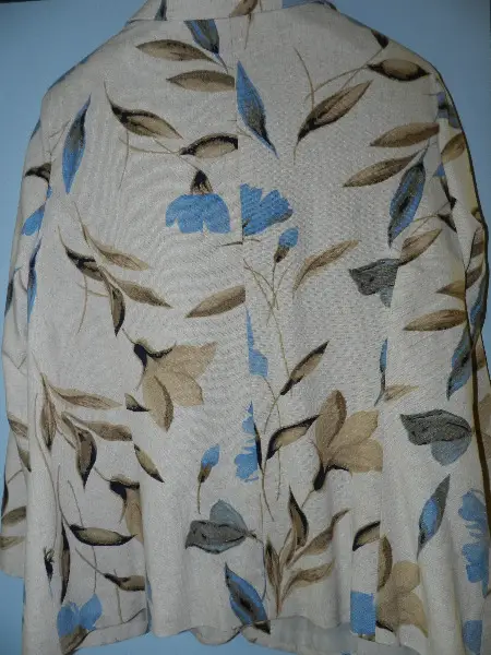 Vermutlich Grösse 40, Rückenlänge ca. 62 cm, Brustweite ca. 52 cm. Der Stoff fühlt sich an wie Leinen oder Leinenmix.