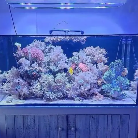 Becken auf: Ca 80kg Lebende Steine, voll mit diversen Weichkorallen, vielen Scheibenanemonen, verschiedene Anemonen, SPS, Euphyllia, Gorgonien und Lederkorallen.