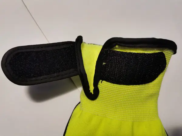 Mit Klettverschluss am Handgelenk um Handschuhe besser zu verschliessen und die Hände besser zu schützen.