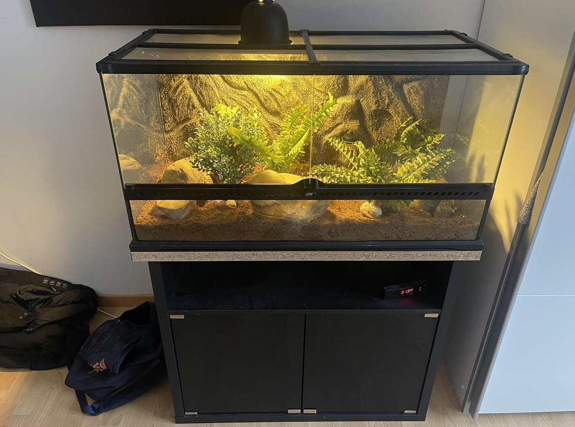 Leopardgecko + Terrarium mit Unterschrank und Zubehör