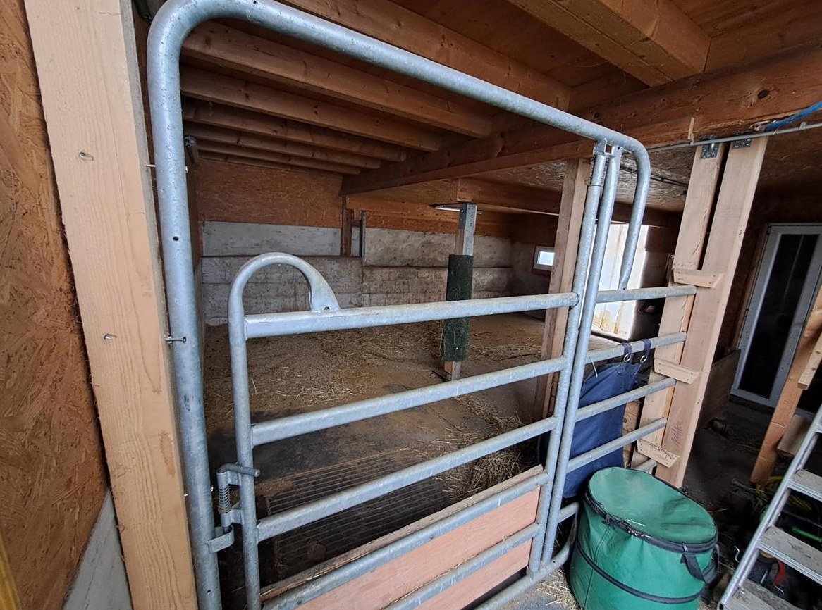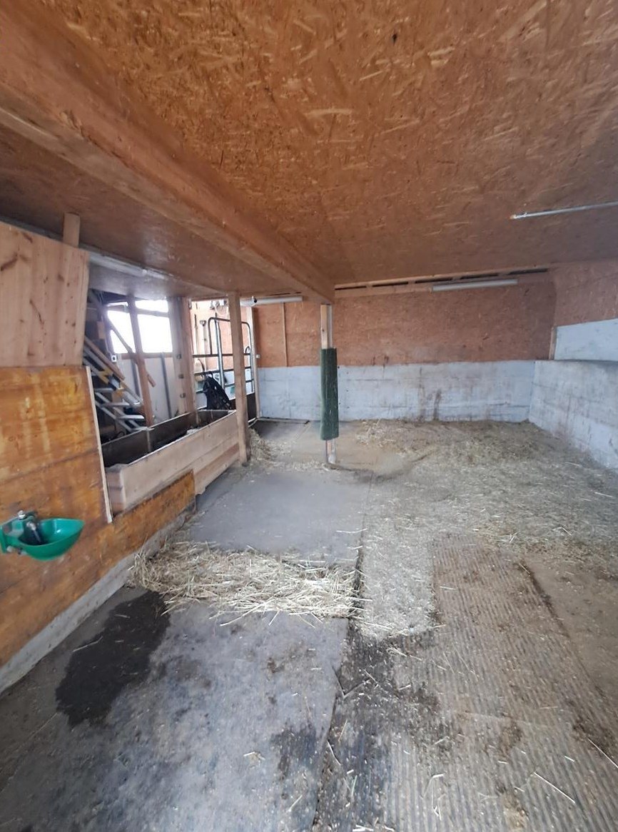 Wir haben den Stall noch umgebaut, Matten verlegt (in der Box und auf dem Paddock) , Heuraufen hingestellt, Weide eingezäumt etc. Auch das Material (Schubkarren, Bollengabeln, Sattelschrank etc.) ist von uns jetzigen Mietern.