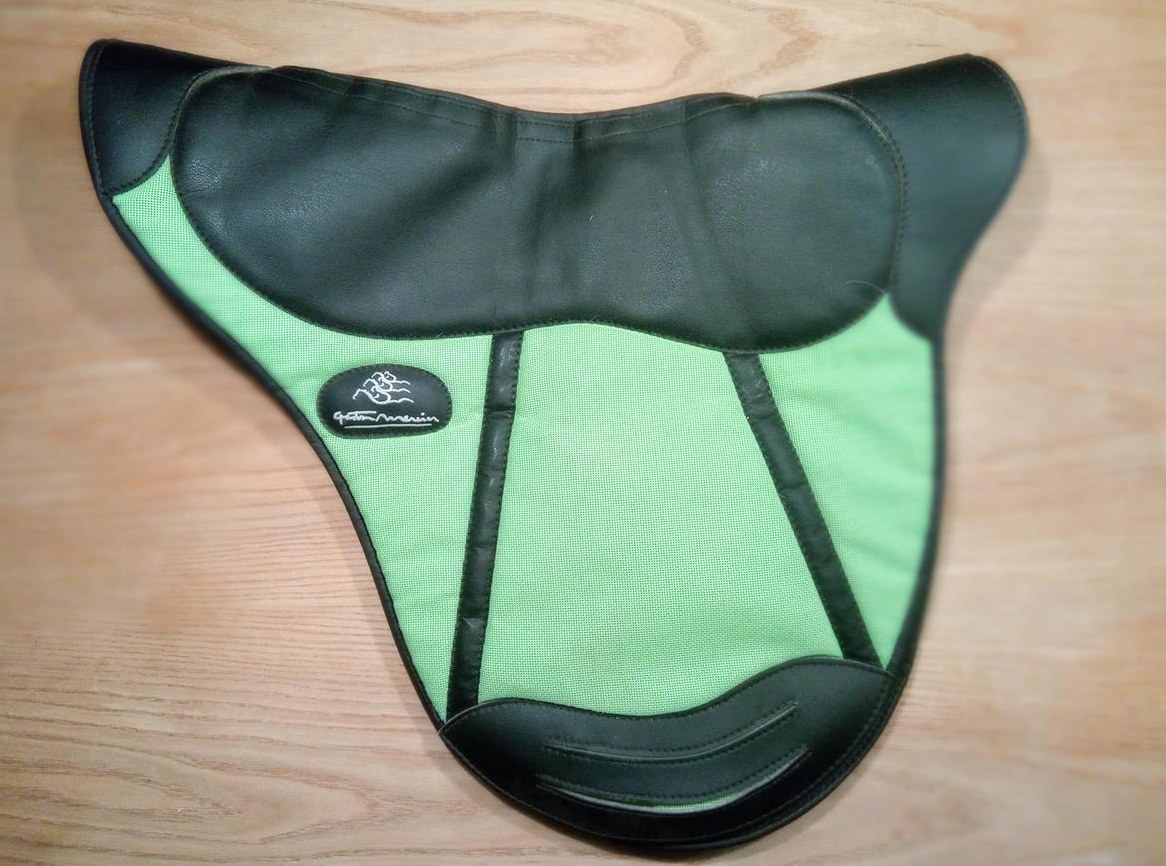 Satteldecke von Gaston Mercier in der Farbkombi hellgrün-schwarz, für Dressur- und Vielseitigkeits-Sättel, optional mit Polster zu bestücken (wurde von mir jedoch ohne Polsterung verwendet) , mit freibleibender Wirbelsäule, fellschonend, schnelltrocknend und maschinenwaschbar.