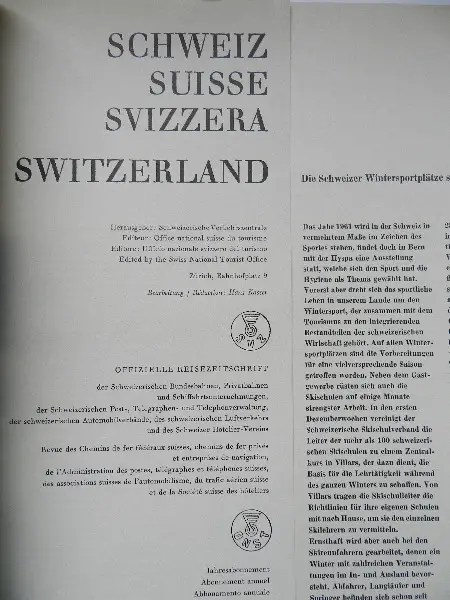 Tolles Heft mit viel Werbung aus jener Zeit! Schweiz, Suisse, Svizzera, Switzerland. Offizielle Reisezeitschrift der Schweiz. Bundesbahnen, Privatbahnen und Schiffahrtsunternehmungen, der Schweizerischen Post-, Telegraphen- und Telephonverwaltung, der schweizerischen Automobilverbände, des schweizerischen Luftverkehrs und des Schweizer Hotelier-Vereins. Herausgeber Schweizerische Verkehrszentrale, 33. Jahrgang, Heft Nr. 12, Dezember 1960, der Einband ist am Rücken oben leicht eingerissen, altersgemäss etwas vergilbt, sonst sehr guter Zustand.